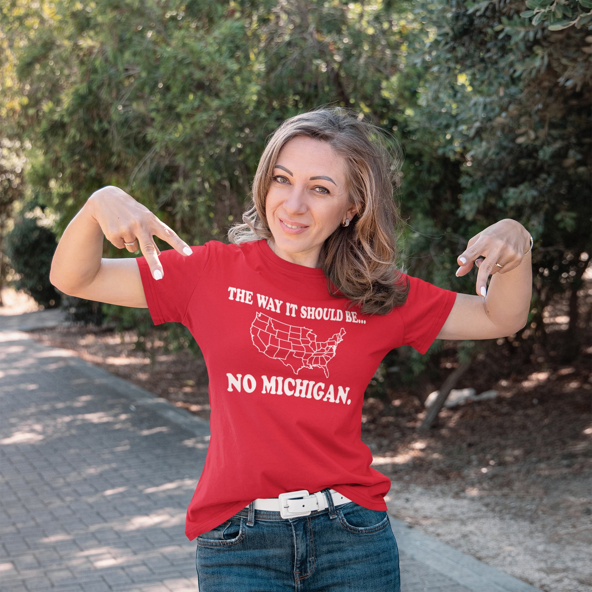 This soft shirt is the perfect way for Ohio State fans to show their disdain for Michigan! Featuring a funny rendition of the US map without Michigan, it's a surefire way to make a statement while staying comfortable! Who said rivalry can't be fashionable? Let everyone know, "The Way It Should Be - No Michigan!"